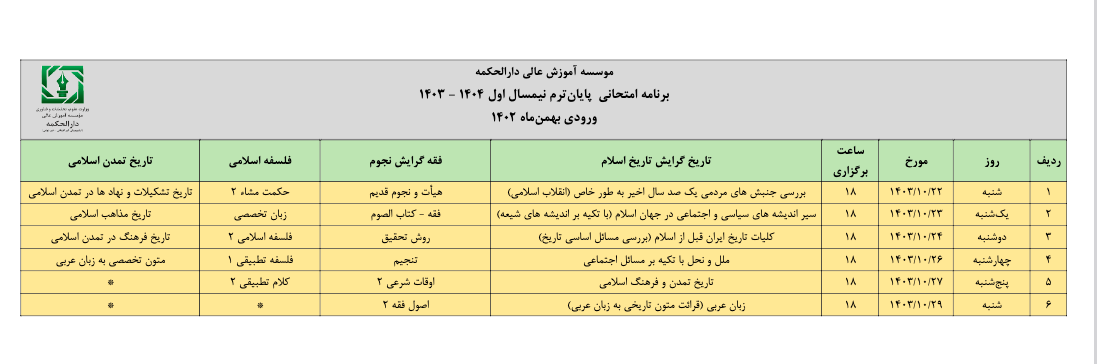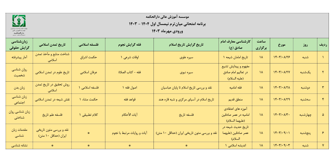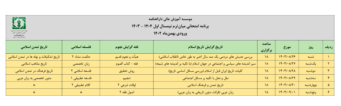 برنامه امتحانی میان ترم و پایان ترم ورودی های 1402 و 1403